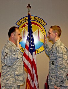 Two generations of Perrottas came together recently here to make new family history. Master Sgt. Camillo C. Perrotta, Sr., a reservist with the 349th Maintenance Squadron, was sworn in for his next to last enlistment by 1st Lt. Camillo C. Perrotta, Jr. Perrotta, Sr., is a first generation immigrant