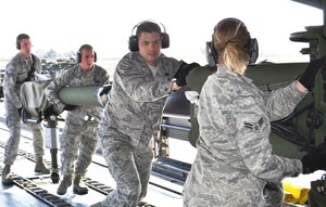 It's not every day Travis Team aerial porters handle cargo like a howitzer. But on Feb. 3, the team got to load two of them, as well as eight cargo pallets, onto a C-5. In a delicate balancing and rolling maneuver, (from the left) Senior Amn. Matt Branstetter, Airman 1st Class Charles Laas, 2nd Lt.