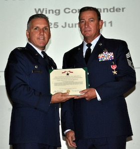 Chief Master Sgt. Terry Kirkbride, 349th Maintenance Squadron, was presented a Bronze Star medal June 25, 2011.Col. Jay Flournoy, 349th Air Mobility Wing commander, cited some of the Chief's actions that earned him the medal, while serving "outside the wire" in Southwest Asia. The Chief said, "I'm