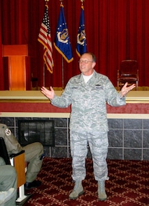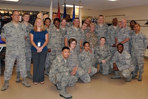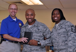 Master Sgt. Ganell Lewis, center, 349th Memorial Affairs Squadron, was surprised by Mr. Trevor Dean and Senior Master Sgt. Michelle Williams, with Senior Noncommissioned Officer of the Month for October. Mr. Dean is the Deputy Commander, and Sergeant Williams is a director of operations for the Air