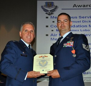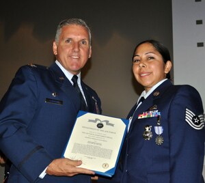 The 349th Air Mobility Wing holds one of it's semi-annual Wing Commander's Call, during which a number of Airmen were awarded medals for going "above and beyond." Col. Jay Flournoy, wing commander, presented Air Force Achievement medals to Staff Sgt. Mary Kathleen Olaes and Tech. Sgt. Jane