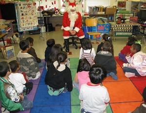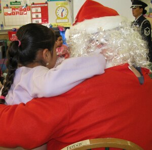 Santa Claus (alias Technical Sgt. Dan Allen, 349th Medical Squadron) listens to the gift request of a kindergarten child at Anna Kyle Elementary School in Fairfield, Calif., Dec. 14. Each year, for more than 25 years, the reservists from the 349th Air Mobility Wing have brought joy to local