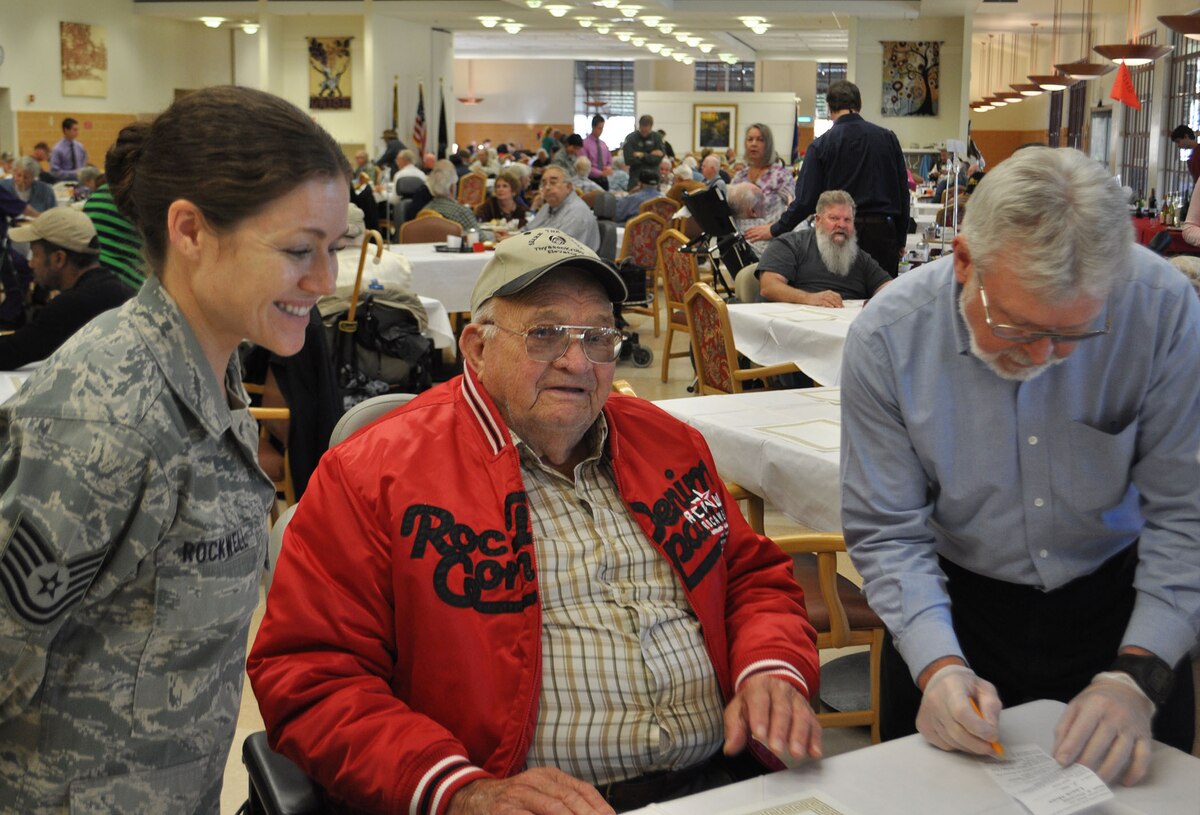 TRAVIS AIR FORCE BASE, Calif. -- Airmen from the 349th Air Mobility Wing "Give Thanks' by serving dinner to these veterans who have paved the way for the military we have today. Along with their friends and family, they share fellowship and a scrumptious turkey dinner with the men and women who, happily, shared there military stories and experiences. (U.S. Air Force photo / Senior Master Sgt. Ellen Hatfield)