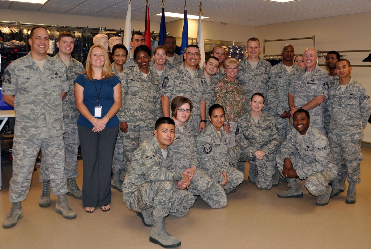 Taking a break from their solemn duties, the staff assigned to the Air Force Mortuary Affairs Operations Center, Dover Air Force Base, Del.,pose for a photo with Chief Master Sgt. of the Air Force, James Roy, (back row, fourth from the right). Chief Roy visited with the Airmen and toured the facility, learning the different facets of their operations. Among the staff deployed to the AFMAO are Senior Amn. Gregory Cody, center, (peeking out from behind taller troops), and on the far right, SrA Jeremy Frias. (U.S. Air Force photo/Staff Sgt. Jamie George)