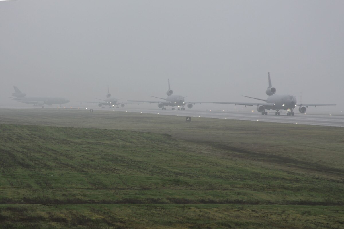 TRAVIS AIR FORCE BASE, Calif. -- Travis Air Force base conducted its first ever “mass launch," Dec. 21. The base launched KC-10s, C-17 Globemasters and C-5 Galaxy cargo aircraft in succession. Once airborne, the aircraft flew in formation then separate to fly normal low-level and air refueling routes. More than 330 training events were conducted during the flights. (U.S. Air Force photo/Tech. Sgt. Robert M. Rossman)