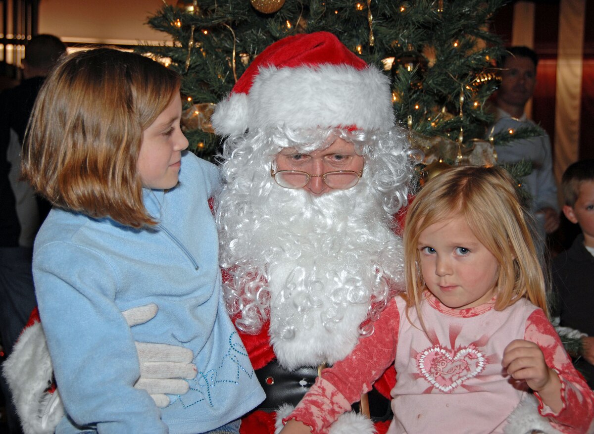 TRAVIS AIR FORCE BASE, Calif. -- Col. Mike Minihan, 60th Air Mobility Wing vice commander, tries to convince Santa that he's been very good this year. Col. Minihan visited the Team Travis Tree Festival and Auction to place his bids on the silent auction and chat with the Airmen and their families. Each year, the 60th Maintenance Operations Squadron and the 349th Maintenance Operations Flight host a Tree Festival and Auction to benefit the Travis Fisher House. Fisher Houses were the brainchild of Zachary and Elizabeth Fisher, who wanted to create a foundation to help military families in need, where they can stay, without charge, by the hospital where their military loved one is being treated. Located on the grounds of David Grant USAF Medical Center, the Travis Fisher House is one of more than 30 built by this foundation. This year's festival raised about $2,700. (U.S. Air Force/photo SMSgt. Ellen L. Hatfield) (U.S. Air Force/photo Senior Master Sgt. Ellen L. Hatfield)